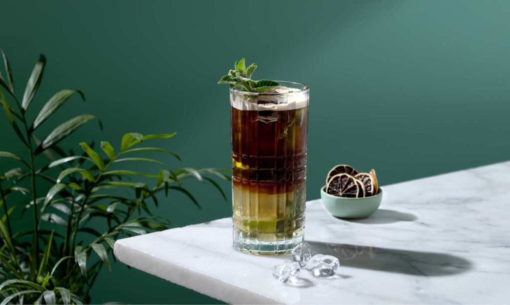 Nespresso Mojito Albahaca: espresso, limón y albahaca con agua con gas, ideal con acompañarlo de un café descafeinado como Arpeggio o Altissio Decaffeinato.