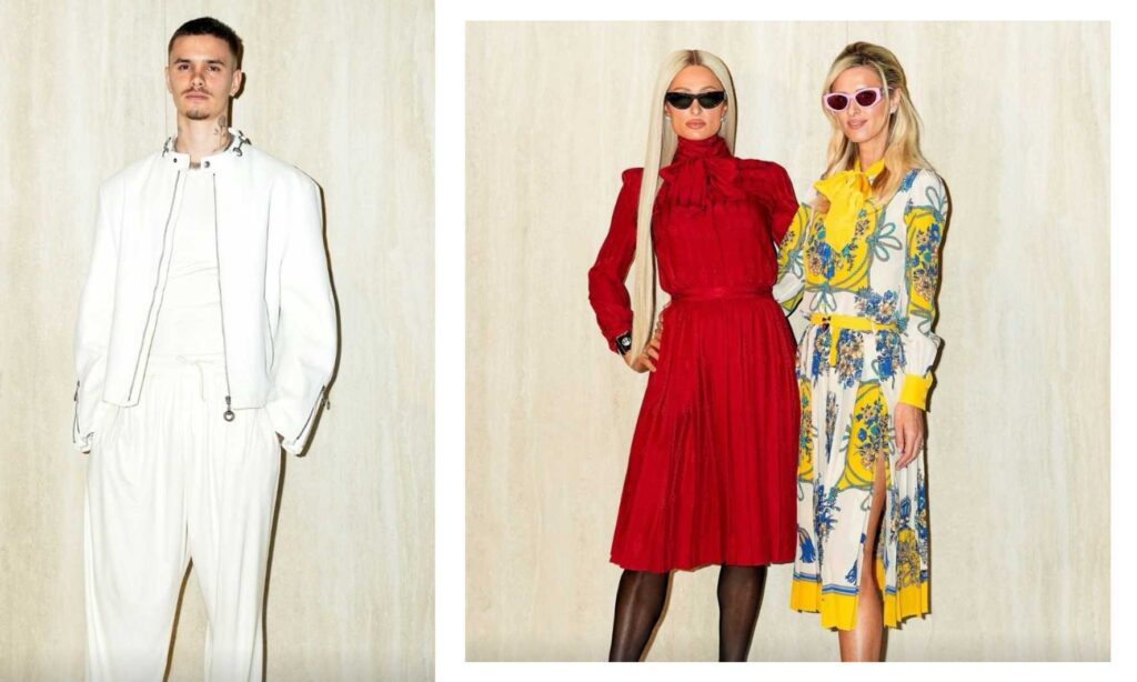 Las hermanas Hilton, por su parte, llevan el volumen cromático al máximo: Paris en un vestido rojo con falda plisada midi y cuello lavallière, Nicky en la misma silueta en amarillo con bouquets florales. Son las guardianas del glamour literal, el de color saturado y teatral, el que sabe perfectamente dónde está la cámara. En la narrativa del front row, crean contraste con el negro de Demi y Philippine y con el blanco de Romeo, componiendo una paleta que parece pensada como un story board.