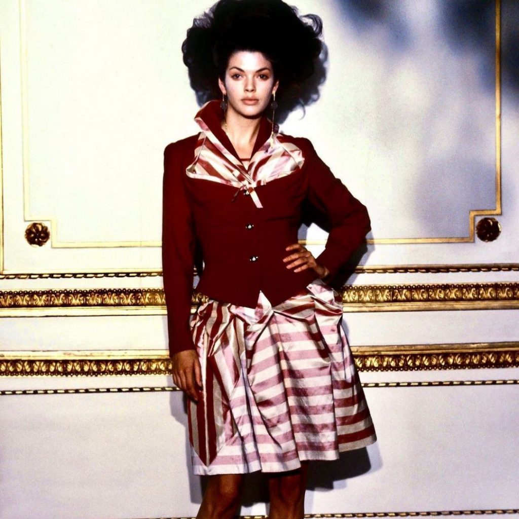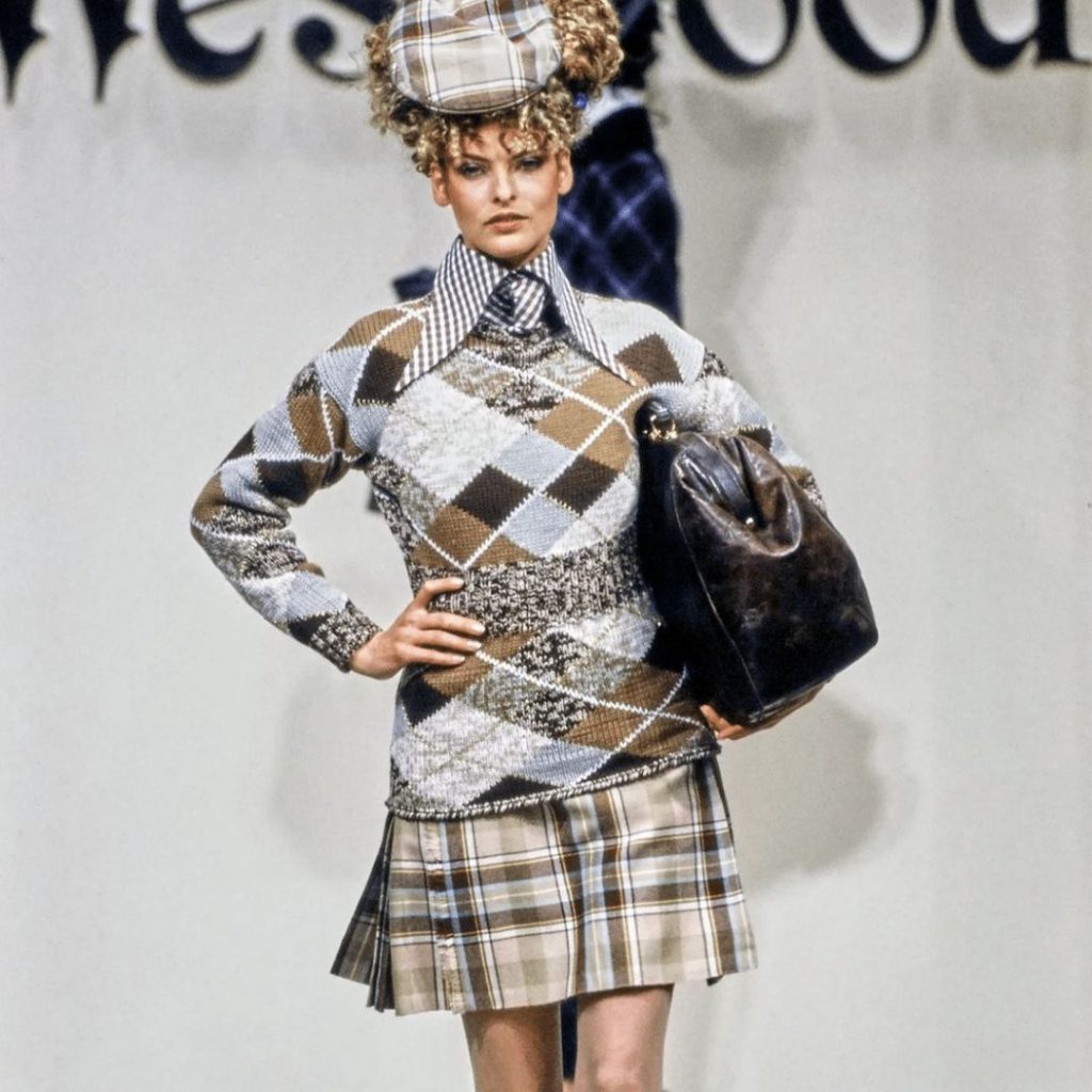 Aunque Vivienne Westwood desfiló en la Semana de la Moda de París, no olvidó sus orígenes británicos. De 1993 a 1999, la diseñadora desarrolló una nueva estética nacida del diálogo entre el estilo inglés y el francés. Esto fue especialmente evidente en su colección otoño-invierno 1993-1994 “Anglomanía”, que mezclaba estampado tartán, pieles, faldas escocesas, tacones de vértigo y siluetas abullonadas dignas de Versalles. “On Liberty”, su colección otoño-invierno 1994-1995, explora de nuevo la historia del traje pero también la sexualidad, a través de piezas de tartán, un vestuario inspirado en la equitación pero también en el humor británico.