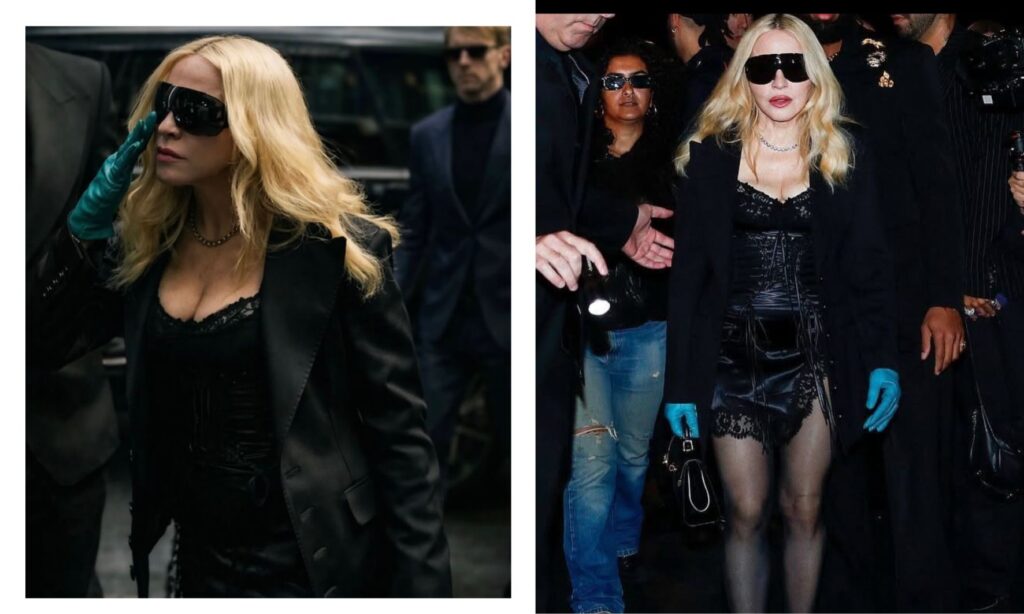 Madonna eligió un total look negro que dialogaba directamente con el ADN de la casa: blazer estructurado sobre un minivestido oscuro, silueta ceñida y un único golpe de color en los guantes de cuero turquesa, que se convirtieron en el punto focal del outfit. Era un look casi monástico visto de lejos, pero cargado de subtexto: recordaba a la Madonna de los trajes de poder, de los corsés, de los videoclips que Dolce & Gabbana lleva décadas referenciando en su imaginería. No era invitada, era literalmente parte de la colección.
